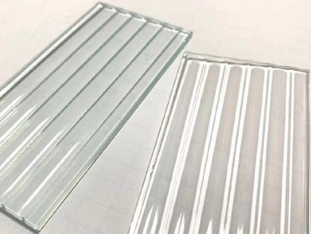 Les motifs pressés sur le verre ont différentes profondeurs, ce qui crée un bel effet diffus lorsque la lumière passe à travers, permettant aux objets derrière le verre transparent à motifs de rester visibles mais d’être opaques lorsqu'ils sont vus de l'autre côté. La surface du verre présente une variété de motifs géométriques, notamment des carrés, des points, des losanges et des rayures, ce qui le rend très attrayant et parfait pour la décoration.